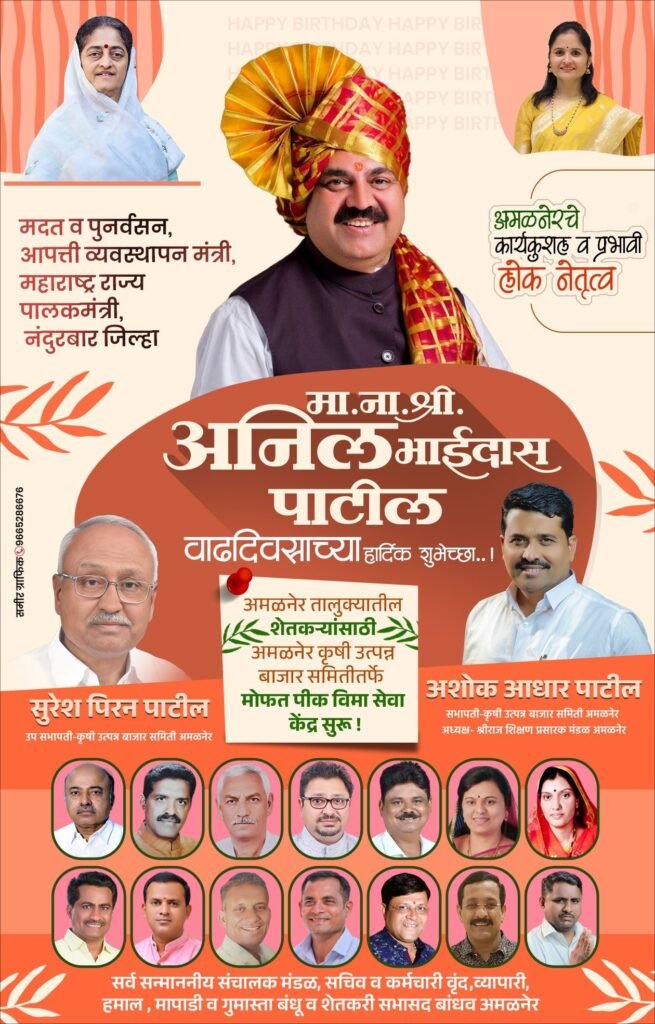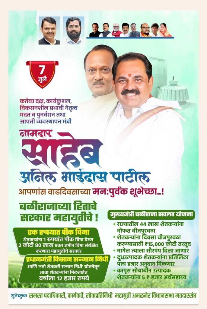 आपण 2019 मध्ये आमदार म्हणून निवडून आल्यानंतर तुमच्या कामाची व अभ्यासू व्यक्तिमत्त्वाची वेगळी छाप पक्षकार्यात पाडली, त्याची पक्षाने नोंद घेऊन अवघ्या काही कालावधीतच आदरणीय पक्षप्रमुख दादासाहेब श्री अजित दादा पवार यांनी तुमच्या मजबूत व विश्वास खांद्यावर “प्रतोद” पदाची जबाबदारी सोपवली. यात भर म्हणून दुग्ध शर्करा योग जुळून आला तो 2 जुलै 2023 ला मंत्रीपदाच्या रूपाने. मंत्रीपदाच्या रूपाने हा गौरव होता अनिल दादांचा, मतदारसंघाचा, कार्यकर्त्यांचा. अजित दादांनी योग्य व्यक्तीची निवड करून व अमळनेर तालुक्याला पहिल्यांदा मंत्री पद देऊन विकासाची गंगाच जणू मतदार संघाच्या दारापर्यंत पोहोचवली.
