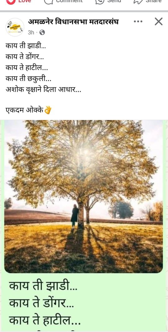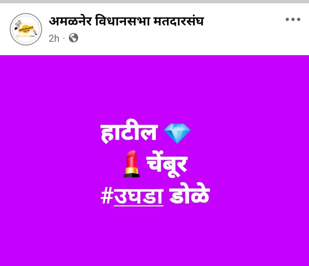 अमळनेर : मुंबईतल्या चेंबूर येथील हॉटेल डायमंडची अमळनेर तालुक्यात मोठी चर्चा सुरू असून ही चर्चा हायप्रोफाईल प्रेमप्रकरणाची असल्याचे बोलले जात आहे. अमळनेर विधानसभा मतदारसंघ या फेसबुक वरील पेजवर या बाबत दोन दिवसांपासून वेगवेगळ्या पोस्ट केल्या जात आहेत. शुक्रवारी – “काय ती झाडी…. काय ते डोंगर…. काय ते हाटील…. काय ती छकुली…. आणि अशोक वृक्षाने दिला आधार….” अशा प्रकारची पोस्ट करण्यात आली होती. तर शनिवारी देखील हे थांबले नसून त्यांनी सरळ हॉटेलच नाव जाहीर करत “हाटील चेंबूर, उघडा डोळे” अशी पोस्ट केली असून एकाने खाली कमेंट देत “त्या ठिकाणी कोण मुक्कामी राहायचं ? उघडा डोळे बघा नीट” असे म्हटले आहे.